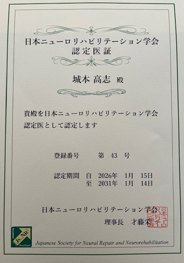 日本ニューロリハビリテーション学会認定医に認定されました。
